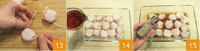 and tie each medallion with a piece of twine to hold its shape during cooking 13: you'll need a total of 12 small medallions. Transfer the monkfish medallions to a baking dish, pour in the Marsala 14, and season with salt and pepper 15, then marinate for about 10 minutes.