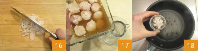 Meanwhile, peel and finely chop the shallot 16. After 10 minutes, drain the fish marinade by straining it through a sieve 17, then sauté the shallot in a pan with a little oil 18,