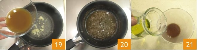 add the marinade liquid 19 and reduce it over low heat for about 5 minutes 20. Transfer the resulting cooking base to a tall, narrow container, add the oil 21,