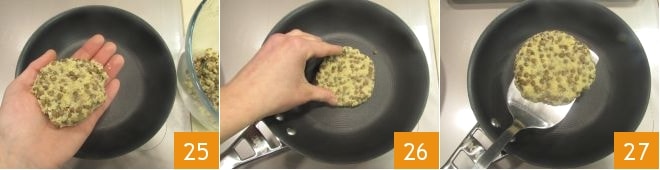 Now you can proceed to cook the rostis: take a generous spoonful of mixture and shape it with your hands into a patty-like form 25, then place it in a hot pan without adding oil 26 and cook until golden brown on both sides 27; it will take about 10 minutes to cook all 6 rostis. Once cooked, set the rostis aside and keep them warm, perhaps in the oven.