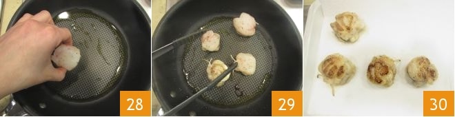 For cooking the fish, heat a little olive oil in a pan, place the medallions inside 28 and brown over medium heat for a couple of minutes on each side 29, then transfer them to a paper towel to remove excess oil 30.