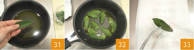 Lastly, prepare the sage leaves for garnishing: heat a small amount of olive oil in a pan, add the leaves 31 and fry for a couple of minutes until crispy 32, then transfer to a paper towel to remove excess oil 33.