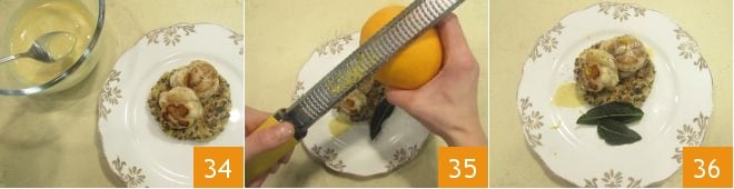 You are now ready to assemble your appetizer: place a rosti on each plate, top with 2 monkfish medallions, after removing the twine, and drizzle with a spoonful of sauce 34. Finally, garnish with 2 crispy sage leaves, some grated orange zest 35, and a sprinkle of pepper: your lentil rosti with monkfish is ready to be served 36!