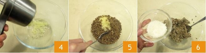 Mash the boiled potato in a bowl 4, add the lentils and mix 5, then add the grated Parmesan cheese 6,