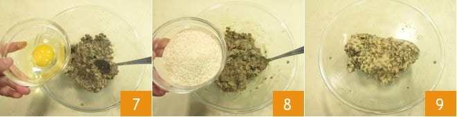 the egg 7, breadcrumbs 8, salt, and pepper. Mix until you obtain a consistent and homogeneous mixture 9 and set aside.