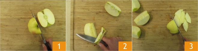 To make the light apple cake, first carefully wash the apples. Cut the apples into quarters 1, remove the central core part 2, and then slice them thinly without peeling 3.