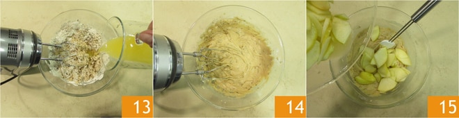 Finally, pour the orange juice 13 and work with the whisks until you get a homogeneous mixture 14. Add the apple slices to the batter, keeping 1/3 aside for decoration 15.