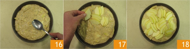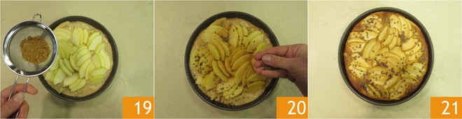 Line the bottom of a 9-inch mold with parchment paper and pour in the batter. Level the surface with a spoon 16 and decorate with the remaining apples 17. You can create a pattern like ours 18 or rays if you prefer.