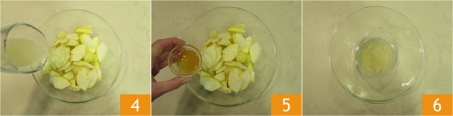 Transfer the sliced apples into a large bowl, add the lemon juice 4 and honey 5. In a separate bowl, pour the egg whites 6,