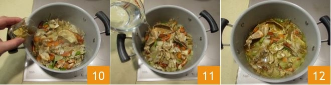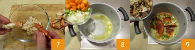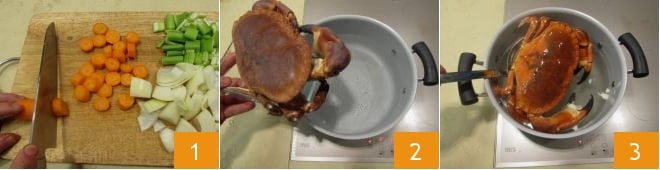 Twist the legs one at a time with a firm motion in the opposite direction to which they are oriented to detach them and extract the hidden meat inside 7. Keep the remnants aside as they will be useful. In a pan, melt the butter and add the oil 8. Add the roughly chopped vegetables and sauté for 5 minutes. Add the crab remnants 9,
