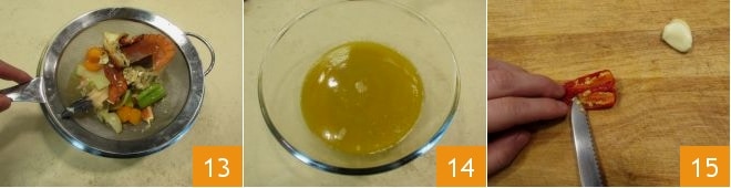 Once ready, strain everything with the help of a fine-mesh sieve 13 and set aside 14. Cut the chili in half and remove the internal seeds 15.