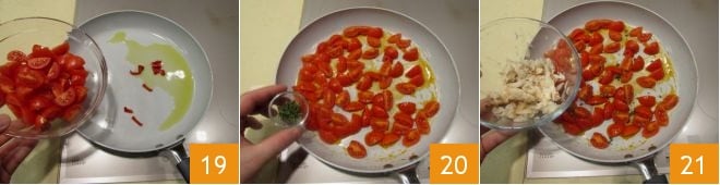 remove the garlic and add the chili and cherry tomatoes 19, season with salt and pepper and add thyme, cooking for 10 minutes 20. Add the crab meat to the pan 21