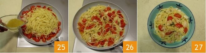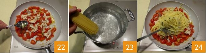 along with the broth you prepared earlier 22, stir with a spatula and turn off the heat. Put a pot with water on the heat, when it reaches a boil, cook the linguine for 8 minutes, leaving it al dente 23. Once ready, drain the pasta and add it directly to the pan with the sauce 24;