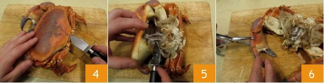 Proceed then to clean the crab: with a small knife, remove the tail flap 4 and separate the top part from the bottom. Remove the stomach sac, the soft gills, as they are not edible, 5 and extract the tender and creamy flesh. Open the claws with pliers 6 and remove the meat in large pieces.