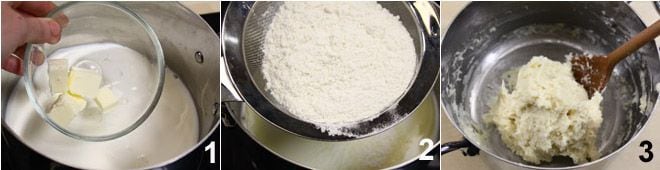 To prepare the dough for the little hearts, pour the milk into a saucepan, add the butter and salt 1 and bring to just below boiling; remove the saucepan from the heat and immediately add the flour, all at once 2. With the help of a spoon, stir vigorously until the ingredients are combined 3 and obtain a rather compact mixture (if it looks lumpy don't worry).
