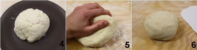 Let the obtained dough cool slightly 4, then transfer it to a lightly floured surface and knead with your hands 5 until you get a smooth and homogeneous dough 6.