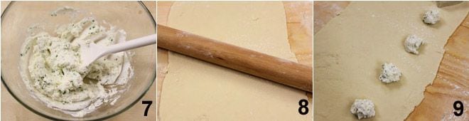 Roll out the dough with a rolling pin 8 forming a rectangular sheet about 1/16 inch to 1/12 inch thick at most: with a teaspoon, take some of the filling and place it in small mounds on the sheet 9 about 4 inches apart from each other.
