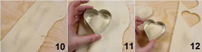 Cover the mounds with dough (folding it like a book) 10 and with the heart-shaped cutter cut out the shapes (11-12). Proceed this way, kneading the scraps each time until the ingredients are used up. Once all the shapes are obtained, take two plates: in one you will put the breadcrumbs and in the other the beaten egg.