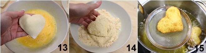 Dip each little heart first in the beaten egg 13, then pass it in the breadcrumbs 14 and fry it in moderately hot oil (not boiling) until golden on both sides 15. Drain the little hearts, place them on kitchen paper towels, and serve immediately.