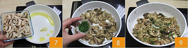 Sauté the champignon mushrooms now, placing them in a pan with oil and two whole garlic cloves (so you can remove them at the end of cooking). Cook over low heat until they are tender, and season with salt and chopped parsley (8-9).