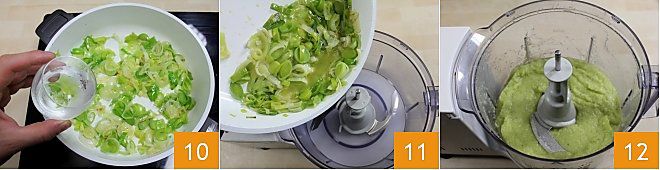 At this point, stew the leek in a pan with a drizzle of oil and half a cup of water 10 for 10-12 minutes. When cooked, transfer the leek to a blender 11 and blend until creamy 12.