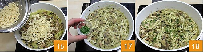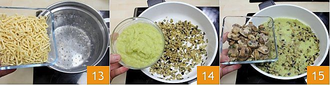 In the meantime, cook the lorighittas in plenty of salted boiling water 13 for the time indicated on the package. In a large pan, combine the other ingredients: the leek cream, the eggplants, and the sautéed mushrooms (14-15).