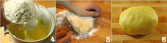 Add the eggs to the cream (1 whole + 1 yolk), 3 one at a time and, without overbeating, add the salt and finally the sifted flour with baking powder 4. Mix well and transfer the dough to the work surface 5, where you will work it until you obtain a smooth and homogeneous dough 6.