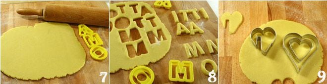 Wrap the dough in plastic wrap and place it in the refrigerator for half an hour. After the necessary time, take the dough, roll it out with a rolling pin on a floured work surface 7 until you get a sheet about 1/6 inch thick; with cutters, cut out the alphabet letters 8 that form the words "I love you", but also "Valentine's Day", "love" and all the words that come to mind and could be suitable for the occasion, such as your partner's name. With heart-shaped cutters, cut out both classic cookies and those to be placed on the rim of cups 9; if you don't have the appropriate cutter, remove a small rectangle of dough with a smooth-bladed knife as shown in the picture.