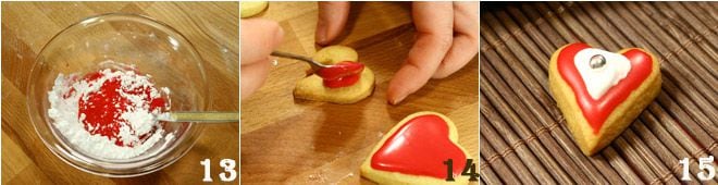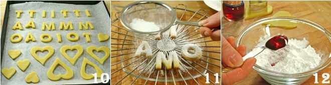 Line several baking sheets with parchment paper and arrange the cookies on them, spacing them a few inches apart 10. Bake in a preheated oven at 338°F for about 15 minutes. Once baked, sprinkle the letters with powdered sugar 11 and prepare the colored glaze to cover the hearts with powdered sugar, coloring, and hot water 12. Mix everything well with a spoon 13.