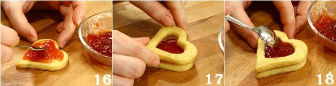 Another idea could be to fill two heart-shaped cutouts with strawberry jam. Take the whole cutout and spread it with jam 16, cover it with the other cutout and then fill the central hole with more jam 18.