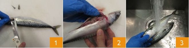 To make the orange mackerel, first, clean the fish: cut the lateral fins 1, slit the belly with a knife and gut it 2, then rinse under running water to clean it 3.