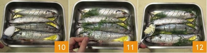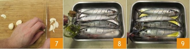 Peel and thinly slice the garlic 7. Grease a baking dish with oil, place the mackerel on top, and drizzle more oil over them 8, add the peppercorns 9,