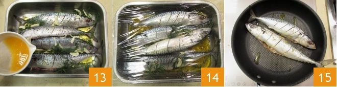 Finally, pour half of the orange juice over the fish 13, cover with plastic wrap 14, and let marinate for 2 hours in the refrigerator. After marinating, proceed to cooking: heat a pan with a drizzle of olive oil, and when it's hot, place the fillets in 15.