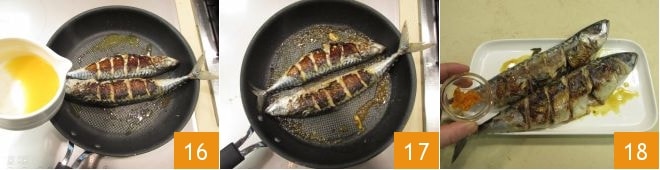 Cook them over high heat for 4 minutes without touching them, then turn them over, pour the remaining orange juice over them 16, and continue cooking for another 2 minutes. Once the sauce has thickened and the mackerel are well flavored 17, serve them immediately, garnishing with grated orange zest on top 18.