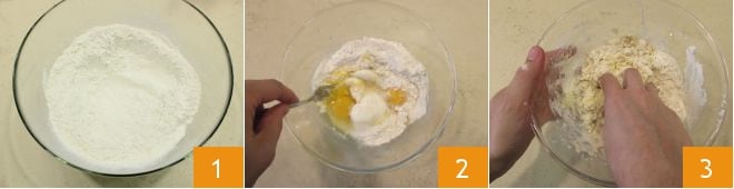 To prepare the maltagliati with spinach and salted ricotta, start by making the fresh pasta. Sift the flour into a bowl 1, transfer it to a pastry board, form a well and add the re-milled semolina, make a hole in the center and widen it slightly. Pour an egg into the center and begin to mix the flour with the egg using a fork 2. Add the other eggs little by little, continuing to knead 3.