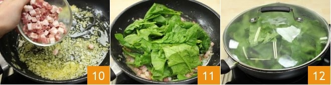 To prepare the maltagliati with spinach and salted ricotta, start by pouring the oil into a pan, add the chopped shallot and let it soften over low heat; then add the bacon and let it brown gently 10. Add the cleaned spinach 11 and cover with a lid so that they cook quickly 12; once cooked, salt them.