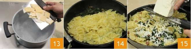 Cook the maltagliati in plenty of salted water 13 and when they are cooked and al dente, drain them and add them to the pan with a little cooking water 14: toss, then pepper and plate. Finally, sprinkle the dishes with grated salted ricotta 15.