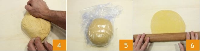 Once you have obtained a compact dough, continue to work it vigorously by hand, pressing it with the palm of your hand 4, then give it a spherical shape and let it rest for 30 minutes at room temperature inside a plastic bag 5. After resting, divide the dough into 3 parts; while you roll out one, keep the others in the bag to prevent them from drying out. Roll each piece with the rolling pin 6, dusting with re-milled semolina as needed, to form a thin rectangle; you should achieve a thickness of about 1/16 inch so that when lifting the dough you can see the shadow of the palm underneath. You can also roll it out with a pasta machine set to the narrowest measure, dusting with re-milled semolina as needed. As you roll out the sheets, lay them on a floured pastry board, cover them with a clean cotton cloth, and continue rolling out the other pieces, stacking them one on top of the other once ready, separated by a dry tea towel.
