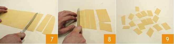 Cut each sheet into horizontal strips 1.25 inches wide 7. Then cut them again into diagonal strips 0.8 inches 8. Place the prepared maltagliati 9 on a lightly floured dry tea towel, waiting to be cooked.