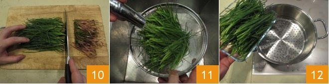 Continue by cleaning the Monk's Beard: remove the reddish end 10, then wash it thoroughly under plenty of running water 11. Steam the Monk's Beard for about 3 minutes 12,