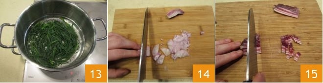 leaving it rather crunchy 13. Cut the shallot into rings 14 then also cut the smoked bacon into thin strips 15.
