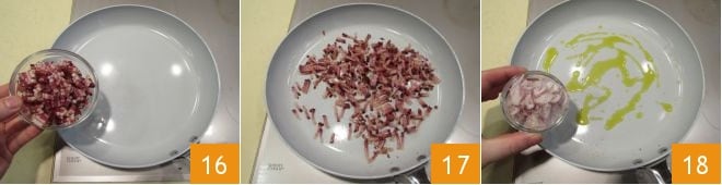 Brown the bacon in a non-stick pan 16 until it becomes crispy and golden 17. Soften the shallot rings in a pan with a drizzle of oil for 10 minutes 18,