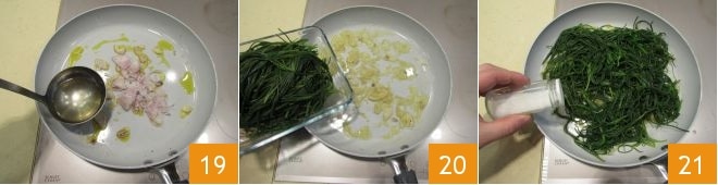 adding the vegetable broth little by little 19. Add the Monk's Beard 20, season with salt and pepper 21,