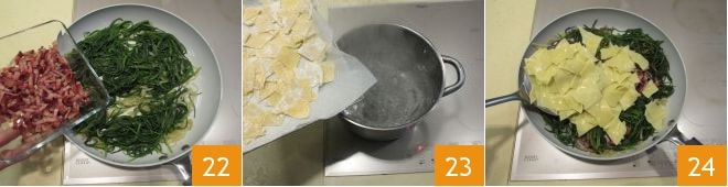 and add the crispy bacon, stirring with a spatula 22. Turn off the heat and set aside. After the necessary time, bring a pot of salted water to a boil and cook the maltagliati in batches for a few minutes 23, then drain them with a slotted spoon. Pour them directly into the dressing you have prepared 24