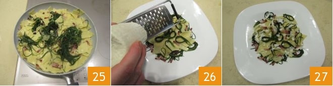 and mix well to flavor, tossing for a few seconds in the pan 25. Plate the maltagliati with Monk's Beard and finish with grated ricotta 26, then serve them hot 27.