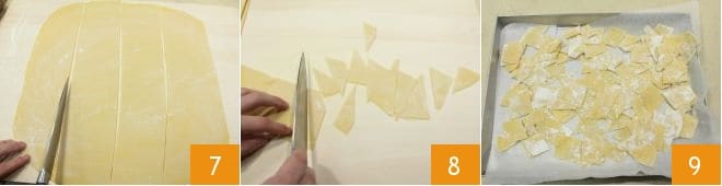 Then cut into strips 7 and cut the pasta into diamonds or any shape 8. Place the maltagliati on a lightly floured tray and flour them again 9. Then roll out the other piece and repeat the same operations.