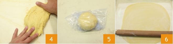 Finish kneading on a work surface to achieve a smooth and homogeneous consistency 4; form a ball and wrap it with plastic wrap 5: the dough should rest for at least 30 minutes in a cool place, away from drafts. After the necessary time, take the egg pasta and divide it into two pieces; while rolling out the first one, keep the other wrapped in the plastic wrap. Roll out a sheet 1-2 mm thick 6.