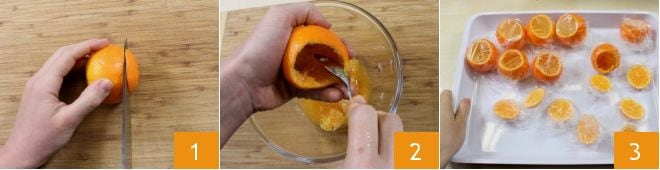 To prepare stuffed mandarins, choose 8 of your largest and most beautiful mandarins, without any bruises, then cut off the top cap 1 and scoop them out using a teaspoon, removing the pulp without damaging the peel 2. Wrap the whole peels and caps, one by one, in plastic wrap and put them in the freezer 3 for at least an hour.