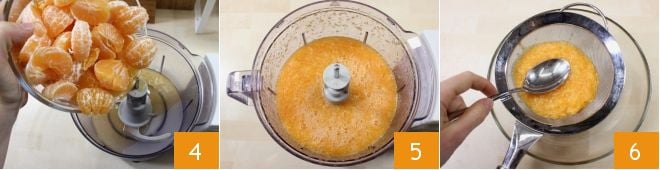 Peel the other mandarins and blend them together with the previously removed pulp in a mixer (4-5). Strain the juice through a sieve, pressing the pulp with the back of a spoon 6.