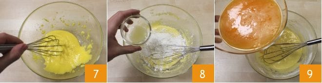 In a separate bowl, beat the egg yolks with the sugar until they become soft and light 7, add the cornstarch and juice of half a lemon 8, mix and finally add the mandarin juice 9.